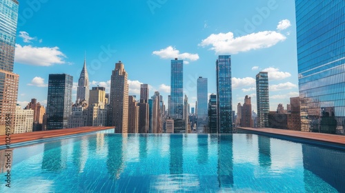 A rooftop pool surrounded by skyscrapers, reflecting the clear blue sky on a sunny day, offering a perfect retreat above the city.