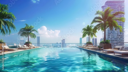 A rooftop pool with panoramic views of a bustling city, surrounded by lounge chairs and palm trees swaying in the warm summer breeze.