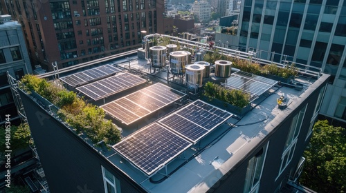 A rooftop with solar water heaters and eco-friendly technology, demonstrating sustainable urban living
