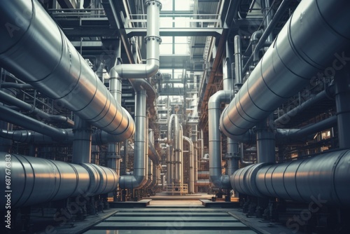 A room filled with numerous pipes. Perfect for industrial and manufacturing concepts.