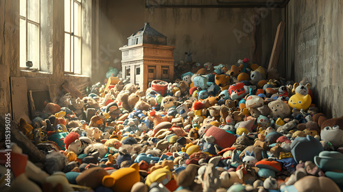 A room full of dust-covered, forgotten toys, [lost childhood], [grief of growing up], 3d illustration. Forgotten - Tower. Illustration