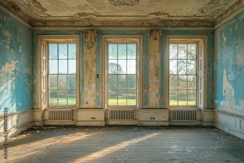 A room with three windows and a blue wall, generative ai image