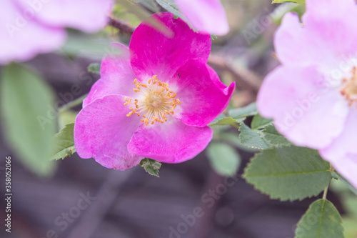 A rosehip (Rosa canina) flower with green leaves on a blurry multifocus background.