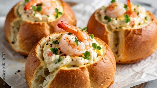 A round loaf filled with a creamy mixture. This mixture contains shrimp garnished with chopped herbs and sprinkled with black pepper.