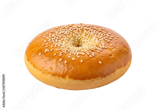 A round sesame seed bagel, golden brown and smooth, is displayed against a dark background.