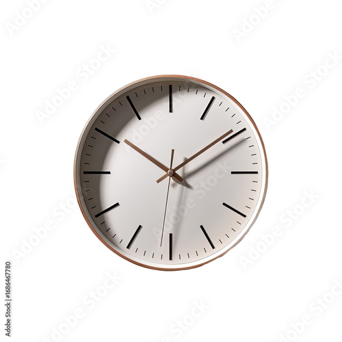A round wall clock with a light beige face and a rose gold colored frame. Clean, simple design with black numerals and hands