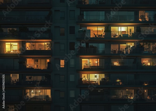 A row of apartment buildings with many windows lit up at night
