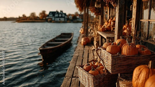 A row of baskets of pumpkins sitting on a dock next to a boat.