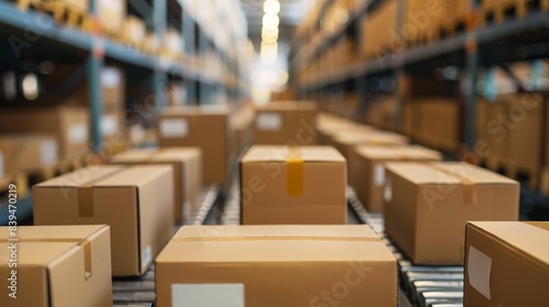 A row of boxes on a conveyor belt in a warehouse