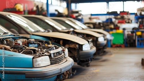 A row of cars with open hoods in a workshop, indicating maintenance or repair activities.