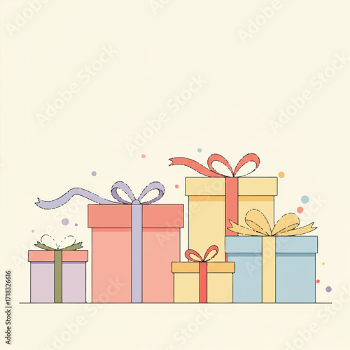 A row of colorful gift boxes with ribbons on a light background