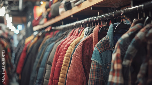 A row of colorful jackets hanging on a rack in a clothing store.
