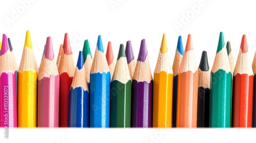 A row of colorful pencils, arranged in a variety of colors, against a white background.