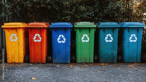 A row of colorful recycling bins for waste separation, promoting eco-friendly practices and environmental sustainability.