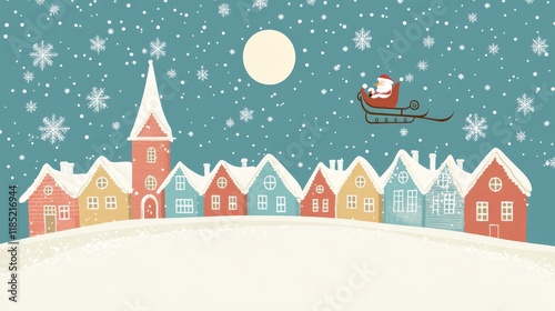 A row of cozy, colorful houses with smoke coming out of their chimneys and the silhouette of Santa Claus flying in his sleigh against the background of a snowy night sky, with moonlight shining throug
