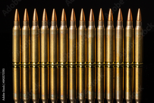 A row of eight rifle bullets stand upright in a straight line on a reflective surface. In front of it, a ball lies on its side and also shows its reflection. The background is black.