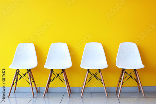 A row of four modern white chairs against a vibrant yellow wall, showcasing minimalist design in a bright interior space.