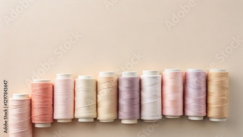 A Row of Pastel-Colored Thread Spools on a Neutral Background, Perfect for Crafting and Sewing Projects