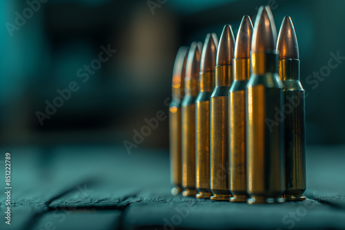 A row of shiny unfired rifle cartridges on a wooden table against a dark background