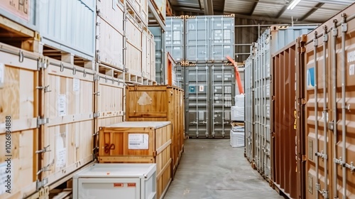 A Row of Shipping Containers and Wooden Crates Inside a Warehouse