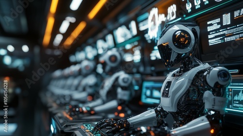 A row of sleek robots operating at trading terminals