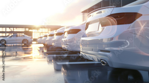 A row of sleek, white cars parked in a shiny, modern lot, glowing under the ambient light of sunrise, suggesting efficiency and sophistication.