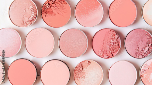 A row of small pink blush palettes and power, beauty product background