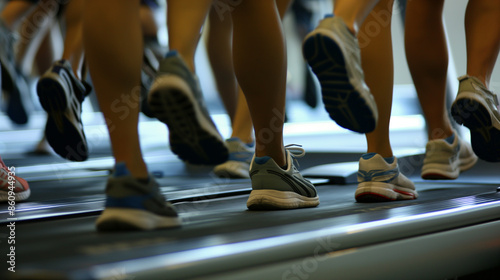 A row of treadmills with people running, gym, cardio, hd, energetic with copy space