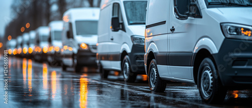 A row of white delivery vans parked on wet asphalt, reflecting city lights on a rainy evening.