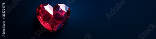 A ruby-red crystal heart with faceted edges, glowing softly against a solid navy blue background