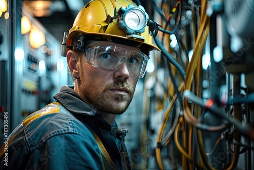 A rugged blue-collar worker dons his hard hat and goggles, ready to take on the world with determination and skill