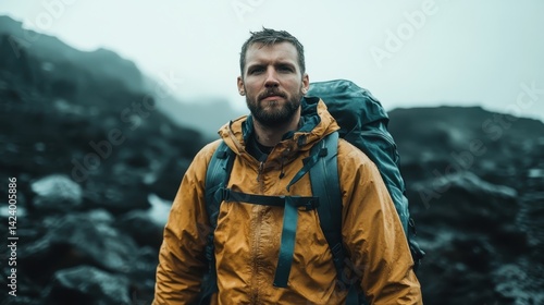 A rugged explorer poses in rainy mountain conditions, emphasizing the challenge and beauty of nature, equipped with essential gear for his adventurous journey.