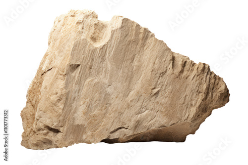 A rugged, irregularly shaped beige rock stone featuring a rough surface and earthy color tones isolated on white background