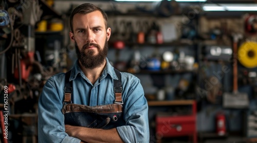 A rugged man with a thick beard, donning a pair of overalls and a casual shirt, stands confidently indoors with a stoic expression on his human face