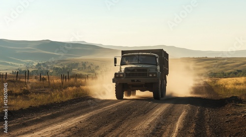 A rugged military truck kicks up dust as it travels along a rural road, surrounded by open countryside with rolling hills and a clear blue sky overhead.