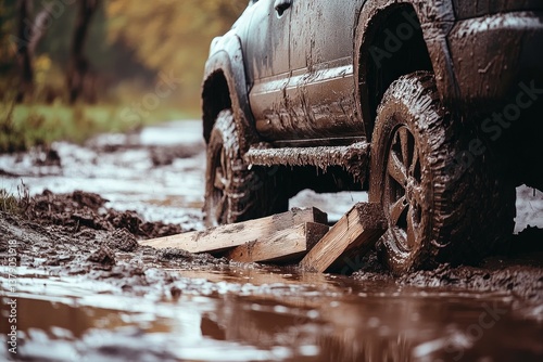 A rugged SUV stuck in the mud, with a traveler placing wooden planks under the tires to gain traction