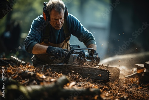 A ruggedly dressed man braves the great outdoors, his powerful chainsaw carving into the earth with determination and precision