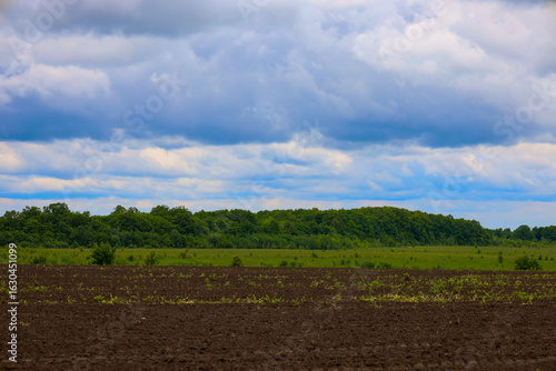 A rural landscape with a plowed field in the foreground, transitioning into a green meadow and then a forest line on the horizon. The cloudy sky creates a sense of space and natural grandeur.