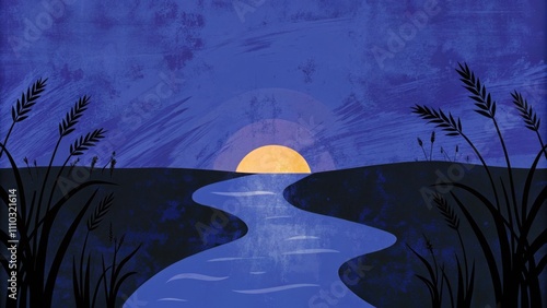 A rural landscape with a winding stream flowing through golden fields at harvest time. The reflection of the sun setting on the horizon dances across the water signifying an. Cartoon