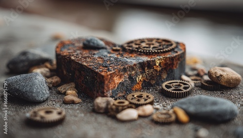 A rusted heart-shaped object, adorned with intricate metal gears, sits amidst a collection of stones