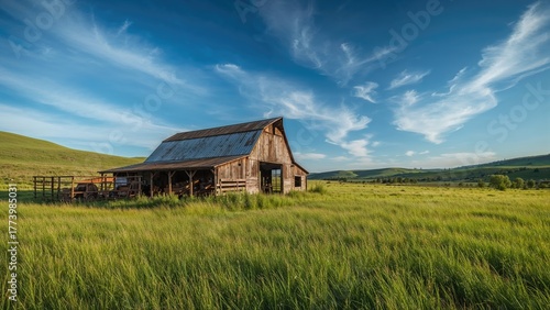 A rustic barn in a green field under a blue sky with clouds.