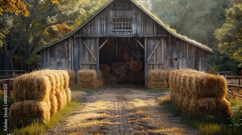 A rustic barn with bales of hay stacked high inside.