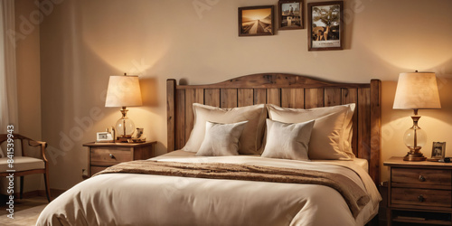 A rustic beige bedroom with a wooden headboard and a vintage-inspired lamp.