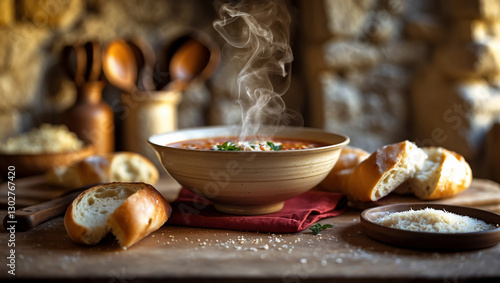 A rustic bowl of steaming soup surrounded by fresh bread and cheese in a cozy, warm setting. Ideal for food blogs, restaurant ads, and home-cooked meal promotions
