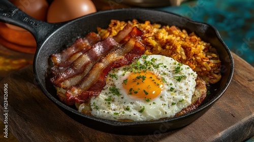 A rustic breakfast of farm-fresh scrambled eggs, crispy bacon, and golden-brown hash browns.