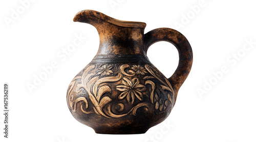 A rustic brown pitcher with floral carvings and a handle against a white background in a studio shot