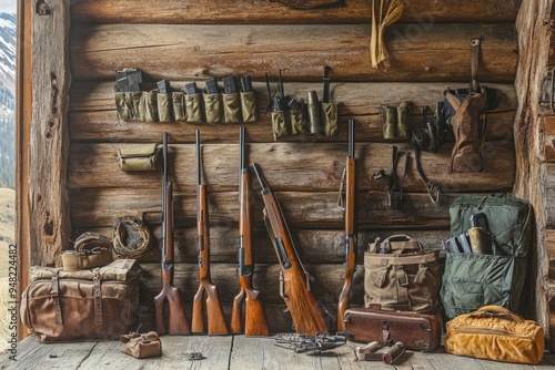 A rustic cabin interior displays an array of hunting gear and rifles. The wooden wall enhances the outdoorsy feel. Perfect for outdoor adventure themes. Generative AI