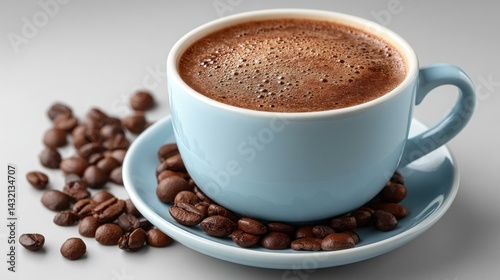 A rustic ceramic coffee cup filled with fresh coffee beans, showcased beautifully against a clean white background.