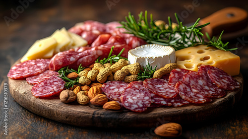 A Rustic Charcuterie Board Featuring Salami, Cheeses, Nuts, and Herbs