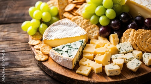 A rustic cheese platter adorned with a variety of artisanal cheeses such as aged cheddar, creamy brie, and tangy blue cheese